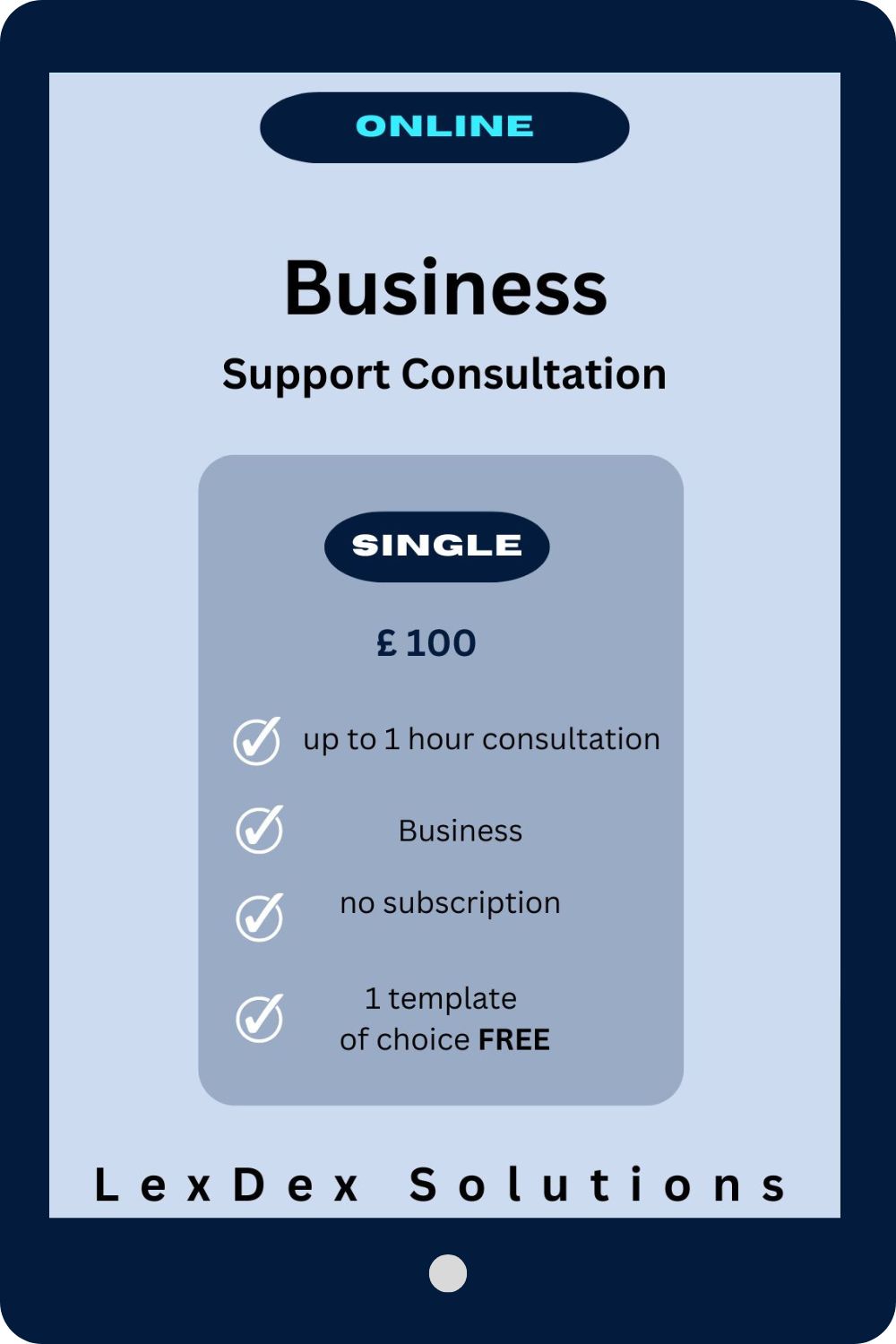 Boost your business with the insights and resources needed to thrive in today’s competitive landscape. Purchase our Business Support Consultation – Single today and take the first step towards securing your business’s legal and strategic success while enjoying significant cost savings and the assurance of no hidden costs or fees.