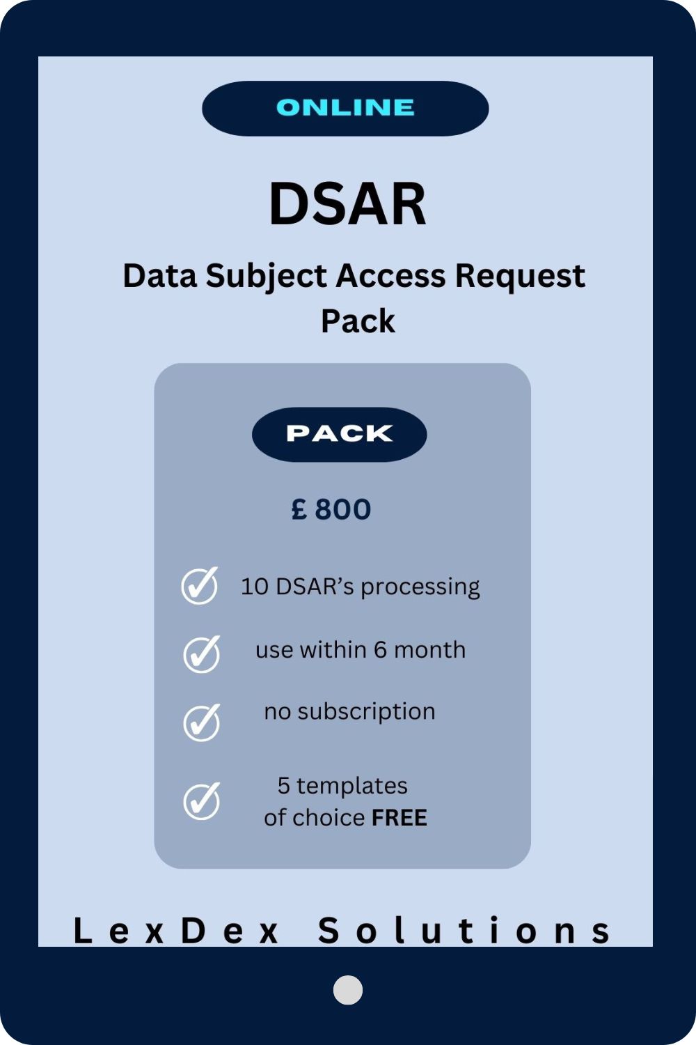 Manage your data subject access requests efficiently with our Data Subject Access Request (DSAR) – Pack. This comprehensive service is ideal for businesses that anticipate receiving multiple DSAR’s over a six-month period but do not want to hire a dedicated employee to handle them. The DSAR Pack includes the processing of up to 10 DSAR’s, ensuring you stay compliant with data protection regulations. Additionally, clients receive five complimentary templates of their choice to support their data management practices. This is a one-time purchase with no subscription required.
